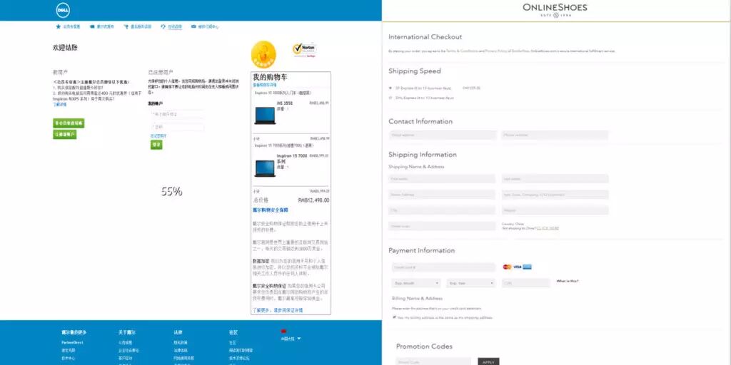 Dell,onlineshoes等网上商城就为用户提供了非注册用户快速结账和注册新用户登录两种方式。